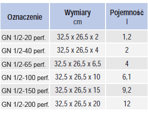 Przy zamówieniu podać oznaczenie pojemnika wg symbolu "Dostępne opcje", np. GN 1/2-65 perf.
