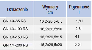 Przy zamówieniu podać oznaczenie pojemnika wg symbolu "Dostępne opcje", np. GN 1/4-65 RS