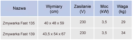 Zmywarka Fast przeznaczona jest do mycia szkła. Dozownik środka nabłyszczającego w komplecie. W wyposażeniu standardowym: 2 kosze na szkło i 1 pojemnik na sztućce. Sterowanie elektromechaniczne, zaawansowane technologicznie ramię myjąco-płuczące mocowane klamrami, łatwe w demontażu, filtry powierzchniowe zatrzymujące największe zabrudzenia, obudowa jednościenna.